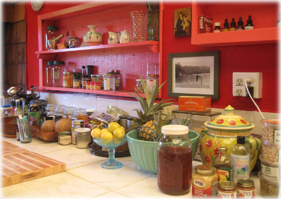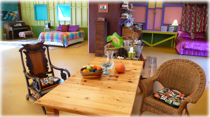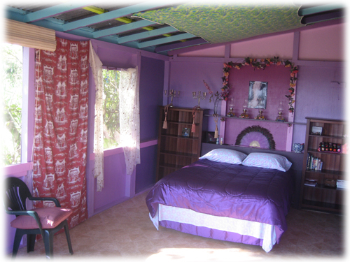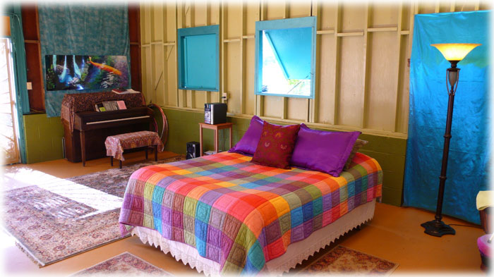 The smaller guest cabin is 370 square feet and was built without a permit (although it is built to code). It is two stories high. On the first floor is a small orchid room where we grow orchids for pleasure. The upstairs consists of a large single room that has built-in bookcases and a queen size bed. Two walls of the cabin are mostly screen, giving sweeping views of the land and sea, and lots of fresh air. The sun rises out of the ocean and shines right on the bed. The interior of the cabin is painted shades of rose and lilac, amplifying the colors of the sunrise. Waking up there to the sunrise is an amazing experience.