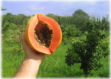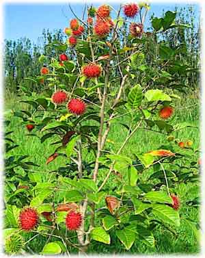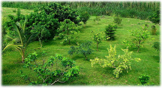 We have approximately 300 trees providing over 50 varieties of fruits, nuts and spices. Included are: Allspice, Avocado, Banana, Brazilian Cherry, Cacao (chocolate, three varieties), Cashew, Champajak, Chocolate Sapote, Cinnamon Sapote, Clove, Coconut (Hawaiian and dwarf Samoan), Cupuacu, Durian (three varieties, both grafted and seedling), Fig (two varities), Grapefruit (yellow and flame) Guava (white, yellow and red varieties), Inga (ice cream bean), Jabotikawa, Jakfruit, Lemon (pink and yellow varieties), Lime (Tahitian and kaffir), Longan, Macademia Nut, Malibar Chestnut, Mamey Apple, Mamey Sapote, Mango (grafted, six varieties), Mangosteen (purple, yellow and cherry varieties), Marang, Mountain Apple, Nutmeg, Neem, Orange (regular and blood varieties), Papaya, Paradise Nut, Pedali, Rambutan (four varieties, both grafted and seedling), Rolinia, Soursop, Sweetsop, Star Apple, Star Fruit (kajang), Tahitian Chestnut, Tangerine (three varieties), Tangelo (minneola), Ulu (breadfruit).